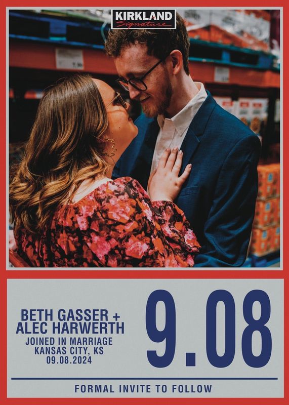 The Harwerths used the engagement photos for their save-the-date invitation designed to look like a Costco food-court menu and then served Costco cake at the wedding.