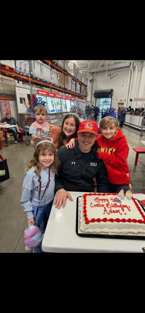So Katie Staley sent out a secret message to friends and family members, inviting them to meet at Costco and spread out throughout the store so they could pretend to run into Adam. Then they all gathered in the food court with Costco pizza and sheet cake to surprise the father of three after checkout. The food court joined in singing "Happy Birthday." Shoppers passing by got slices of cake.