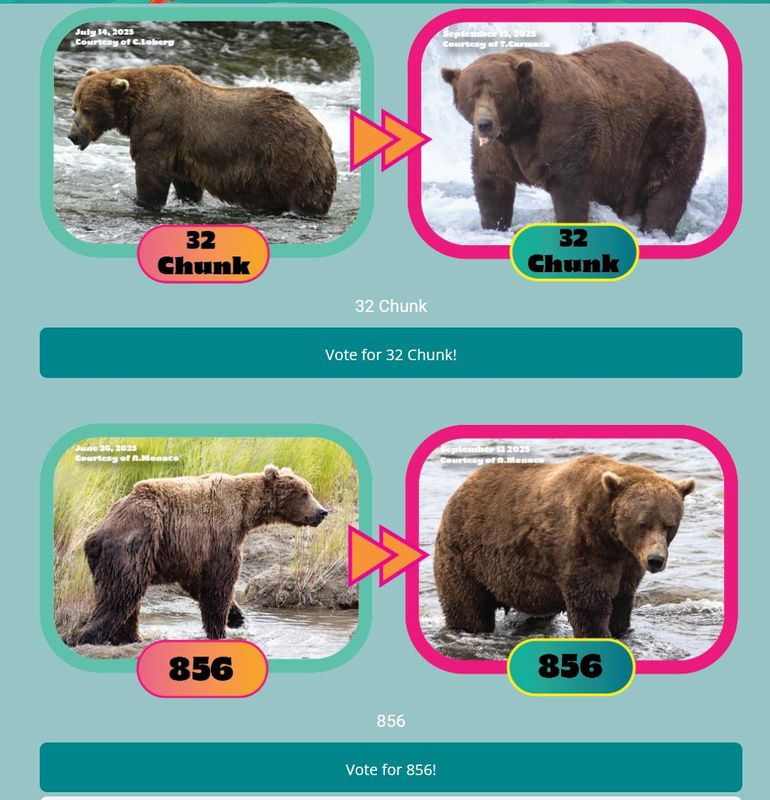 Out of more than 160,000 votes, Bear 32 Chunk, a male weighing over 1,200 pounds, topped Bear 856, a grizzled veteran male bear, to become champion.