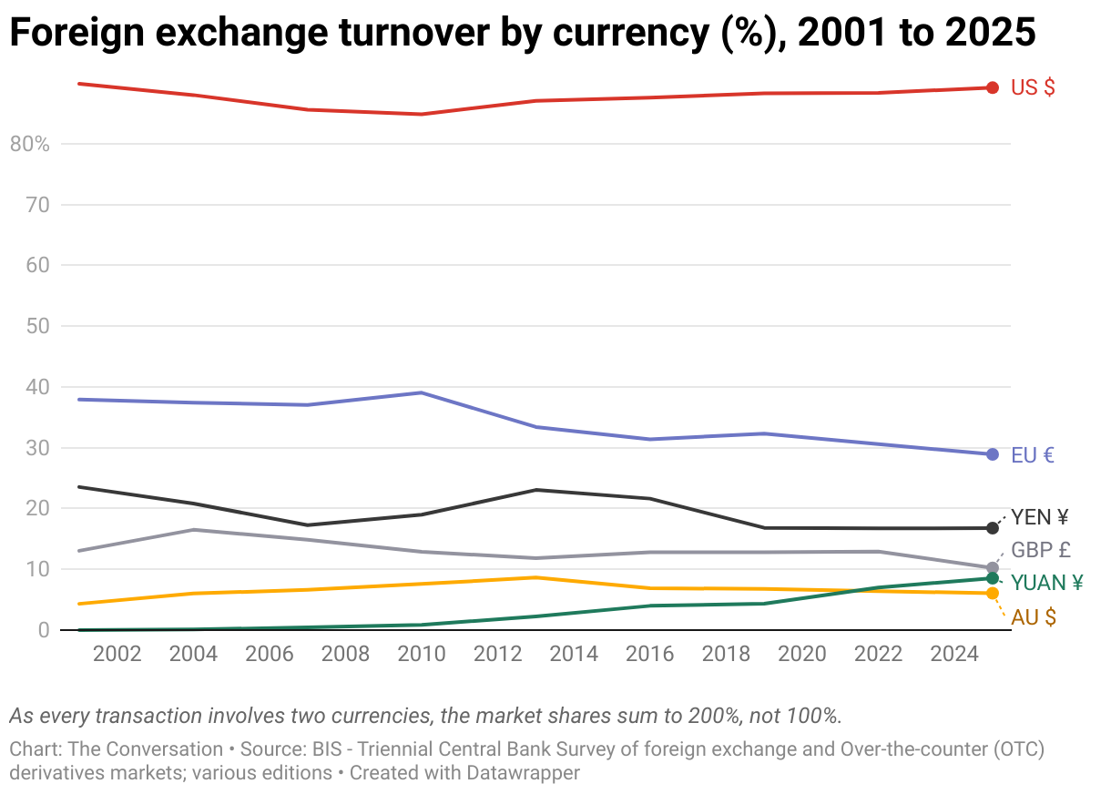 Notwithstanding much discussion about challenges to the US dollar’s position, the trading data show little change. The US dollar was involved in 90% of foreign exchange transactions in the first survey in 1989 and 89% in 2025.