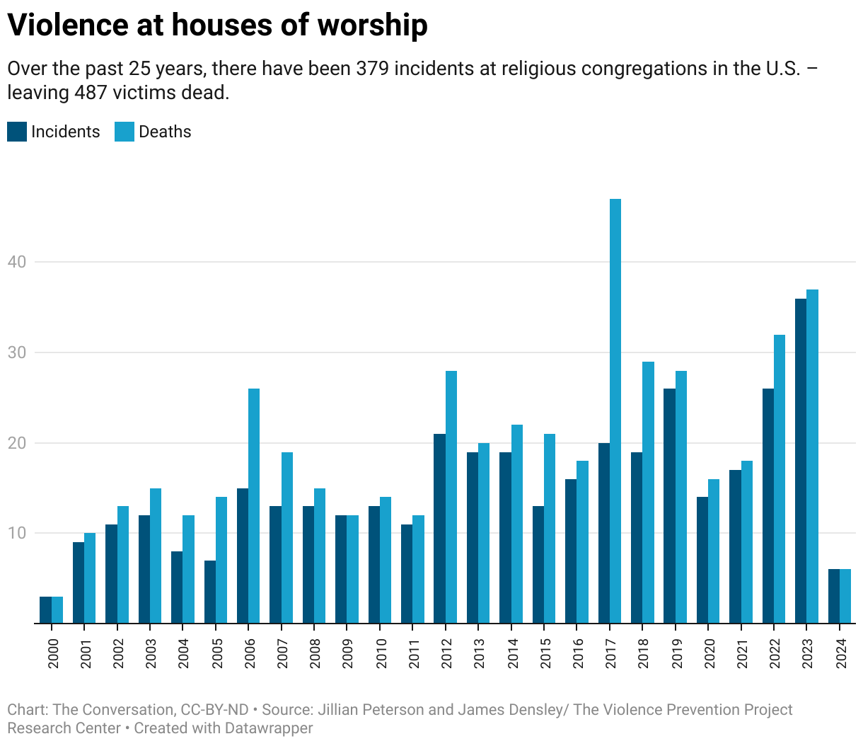 From 2000 to 2024, the dataset records 379 incidents and 487 deaths at religious congregations and religious community centers. Most involved a single victim, but some – like the recent shootings in Michigan and Minnesota – killed or injured many people.