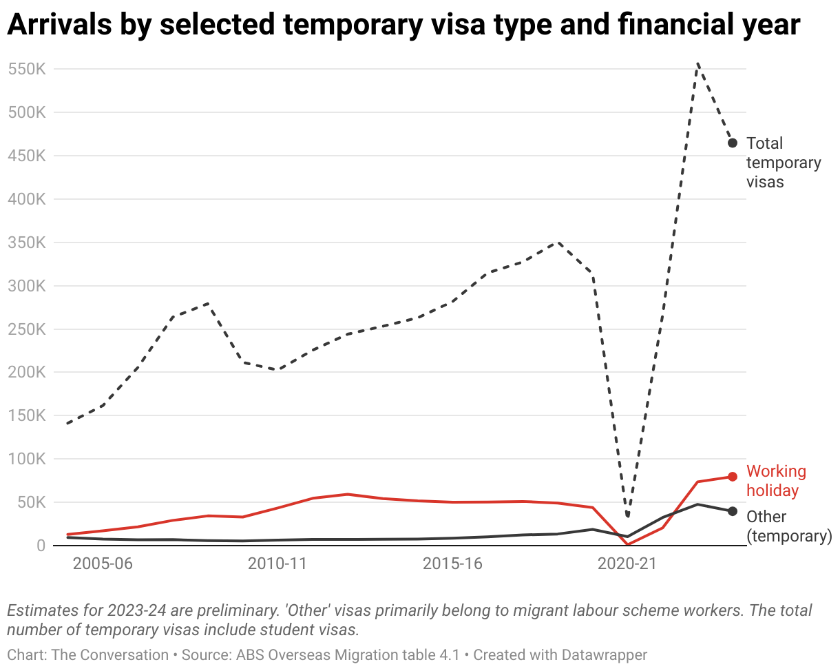 In June 2024, there were 173,216 working holiday makers in Australia (mainly in urban areas) and in December 2024, there were 27,260 PALM workers in regional Australia.
