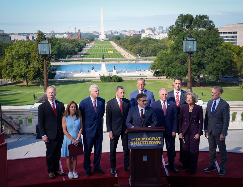 House Speaker Mike Johnson reiterated his arguments against the shutdown for reporters Oct. 6 in imploring Senate Democrats to reopen the government.