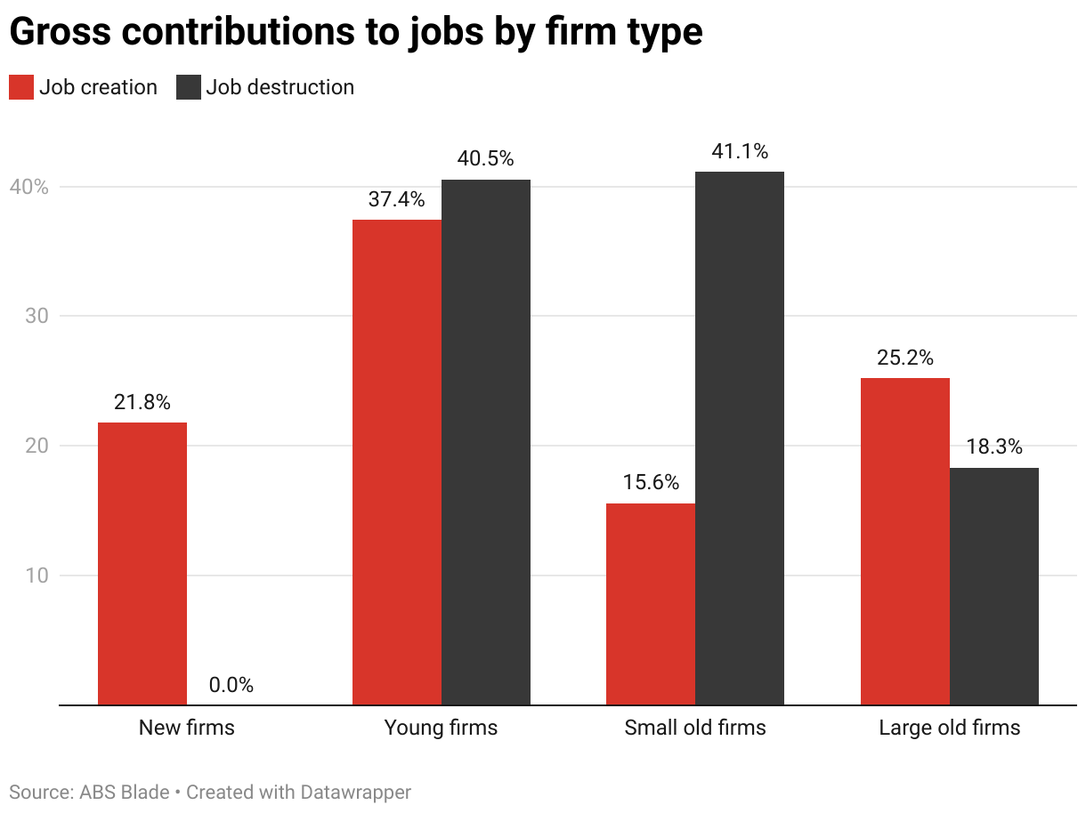 This is even more stark when comparing job losses: small old businesses account for 41% of all job destruction. Large old businesses – often the focus of announced corporate layoffs – account for 18% of job destruction.