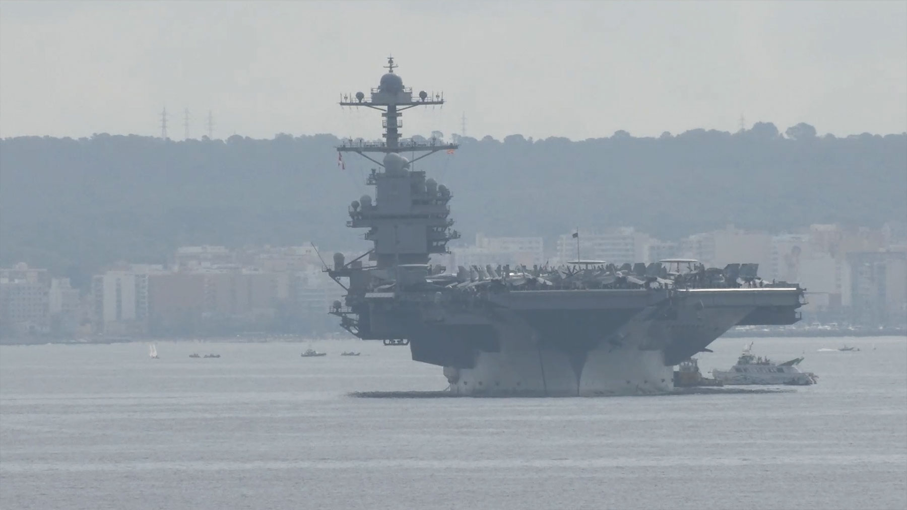 En un vídeo al que ha tenido acceso a OKBALEARES, una embarcación que navega cerca del USS Gerald R. Ford recibe el mensaje de que podría sufrir algún incidente en su embarcación si no se aleja del portaaviones, aunque la cosa no fue a mayores.