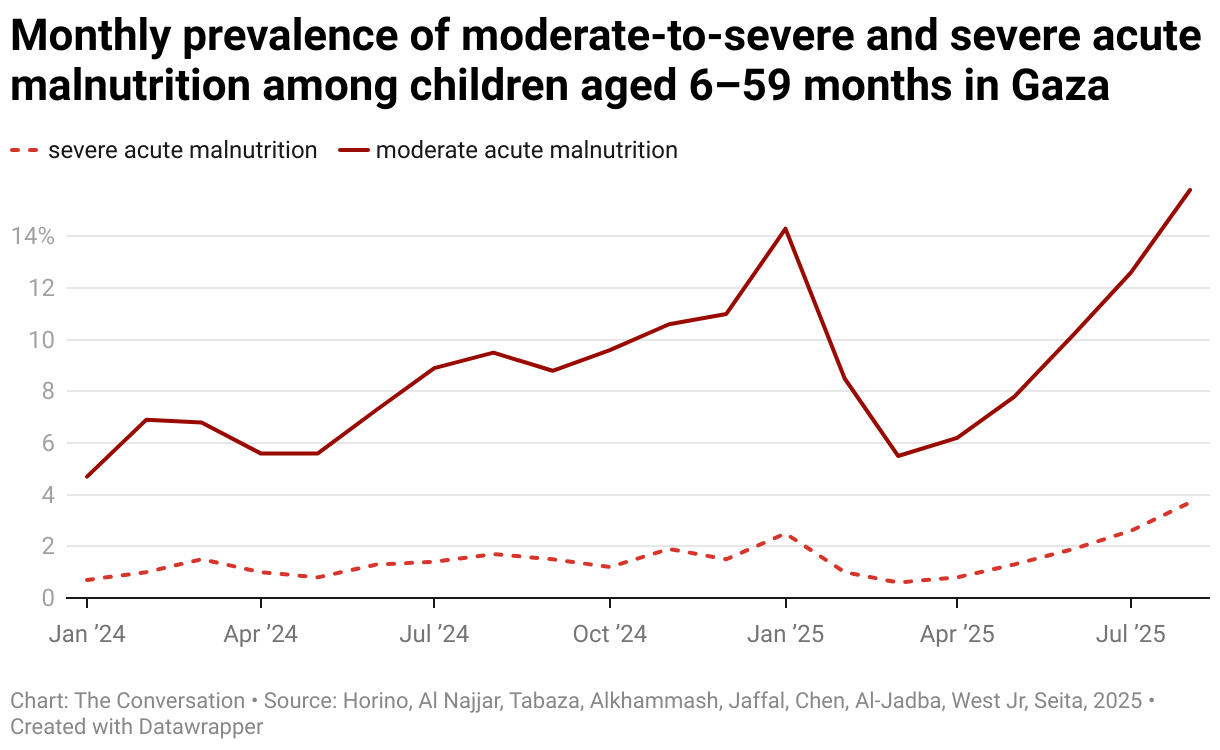 When more than 15% of the population experiences acute malnutrition, the World Health Organization classifies this as “very high” – its most severe category. In August ,the overall rate of acute malnutrition among study participants in Gaza was 15.8%.
