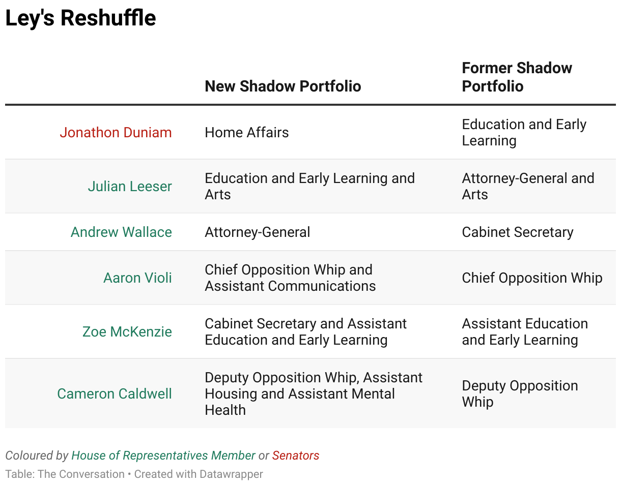 Julian Leeser, from NSW, who has been shadow attorney-general, will replace Duniam as spokesman on education and early learning. Leeser will continue as shadow minister for the arts.