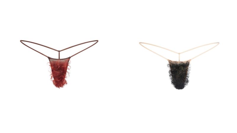 Kim Kardashian's shapewear brand – known for nipple bras, sculpting face wraps and hip-enhancing padded shorts – is back with faux hair micro string thongs. The company dropped the "daring" new panty in a 1970s-inspired campaign, in a mock dating show dubbed "Does the carpet match the drapes?" referencing the pubic hair-like appearance of the thongs.