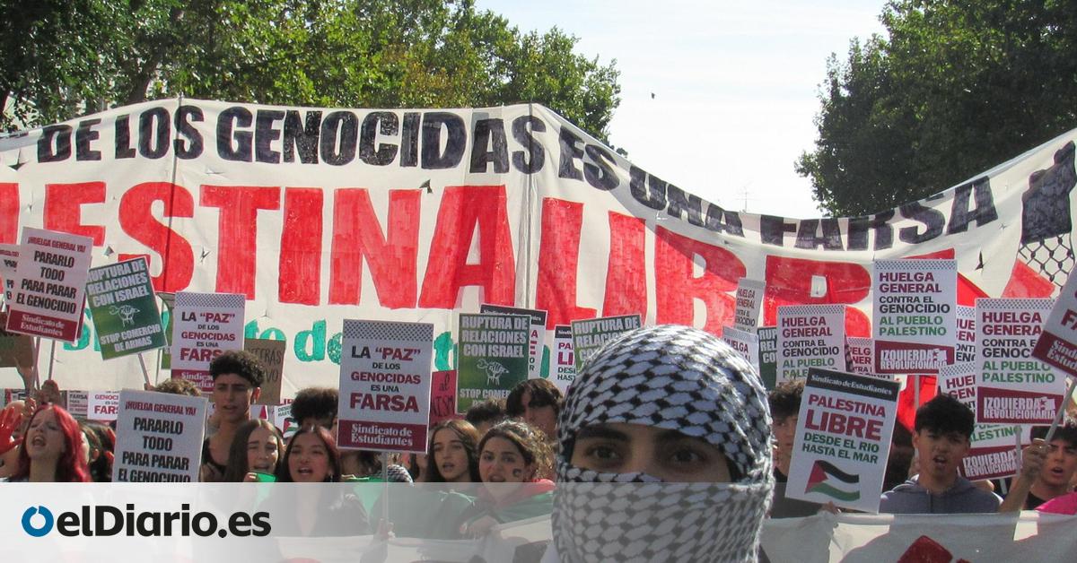 El acuerdo de paz de Trump y Netanyahu no ha sido suficiente para frenar la movilización de estudiantes este miércoles en Madrid, donde miles de jóvenes han salido a las calles al grito de “esta paz es una farsa”. Convocada por el Sindicato de Estudiantes —desde Atocha hasta Sol—, la manifestación ha vuelto a teñir las calles con banderas palestinas y de los colectivos que se sumaron a la marcha, las mismas que ondearon el pasado 2 de octubre, y también se han realizado pintadas en establecimientos comerciales. Esta vez, la protesta se enmarca en la huelga general y los paros parciales convocados por los sindicatos en varias ciudades de España para exigir una “paz duradera” en Gaza.
