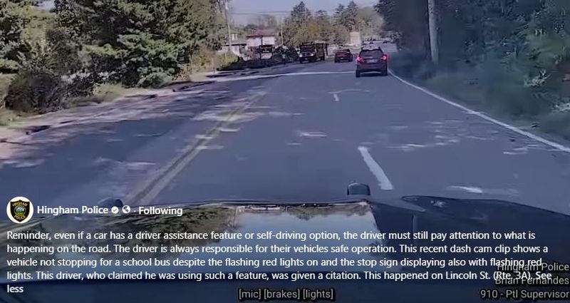 A new police video shows a car in driver-assist mode passing a stopped school bus, Hingham police in Massachusetts say.