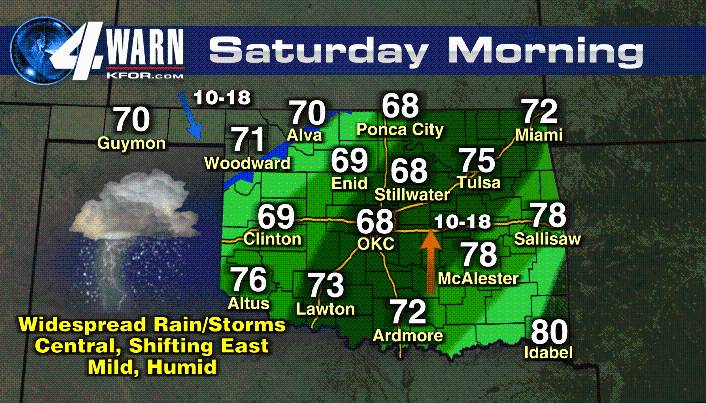 Major storm system tracks across our State Saturday Sunrise thru Saturday sunset, West to East. OKC Metro look for rain and a few storms 8AM to Noon Saturday, with only very slow PM clearing. High of only 72 degrees. Up to 1/2" of rainfall. Sunday will be sunny, cool and crisp! Mike #okwx 10.17.25