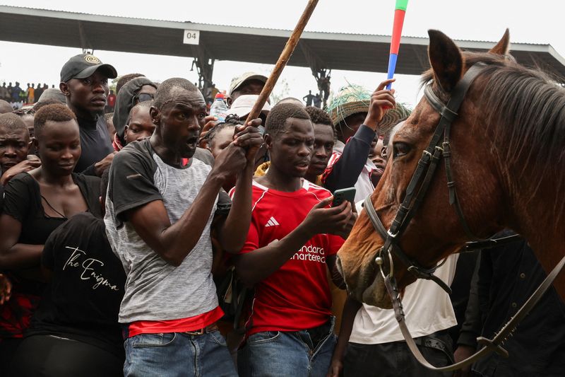 Mourners reacts as a police officer on a horse tries to contain the crowd lining up to view the coffin of Kenya's former Prime Minister Raila Odinga during his funeral service at the Jomo Kenyatta Stadium in Mamboleo, in Kisumu County, Kenya, October 18, 2025. REUTERS/Monicah Mwangi