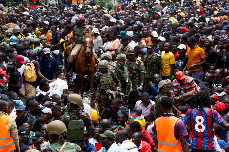 Police officers and military personnel control the crowd during the funeral service for former Kenyan Prime Minister Raila Odinga, at the Jomo Kenyatta Stadium in Mamboleo, in Kisumu County, Kenya, October 18, 2025. REUTERS/Thomas Mukoya