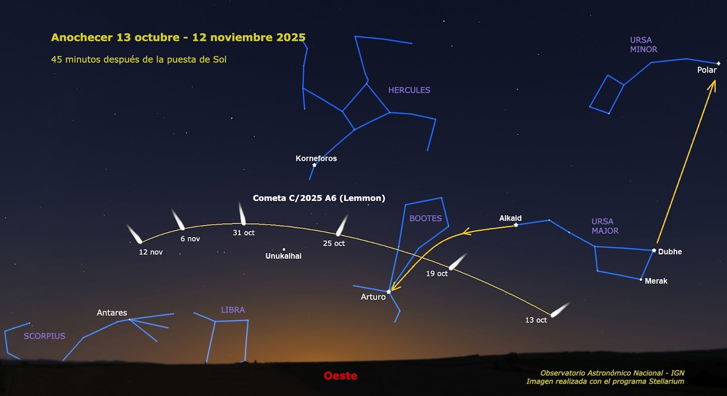 En ese mapa celeste del Observatorio Astronómico Nacional (OAN-IGN) comprobamos que el cometa se va desplazando noche tras noche hacia el oeste. A finales de octubre el cometa pasará entre las estrellas Korneforos, segunda estrella más luminosa de la constelación de Hércules, y la estrella Unukalhai, la más destacada de Serpens.