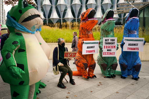 Demonstrators in costumes hold placards during a protest outside the U.S. embassy, in London, Saturday, Oct. 18, 2025.(AP Photo/Alberto Pezzali)