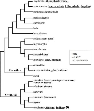 Cabe destacar que, si bien los elefantes poseen VEN, comparten este rasgo solo con otros grupos de cerebros grandes (cetáceos y grandes simios –chimpancés, bonobos, gorilas, orangutanes y humanos–) y no con sus parientes más cercanos.