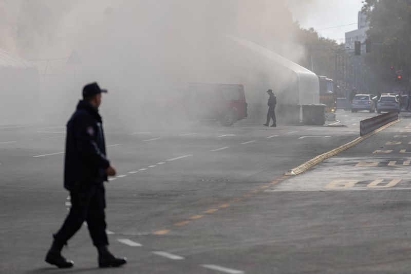 A firefighter works as smoke rises from a burning tent following an incident in front of the Parliament in Belgrade, Serbia, October 22, 2025. REUTERS/Djordje Kojadinovic