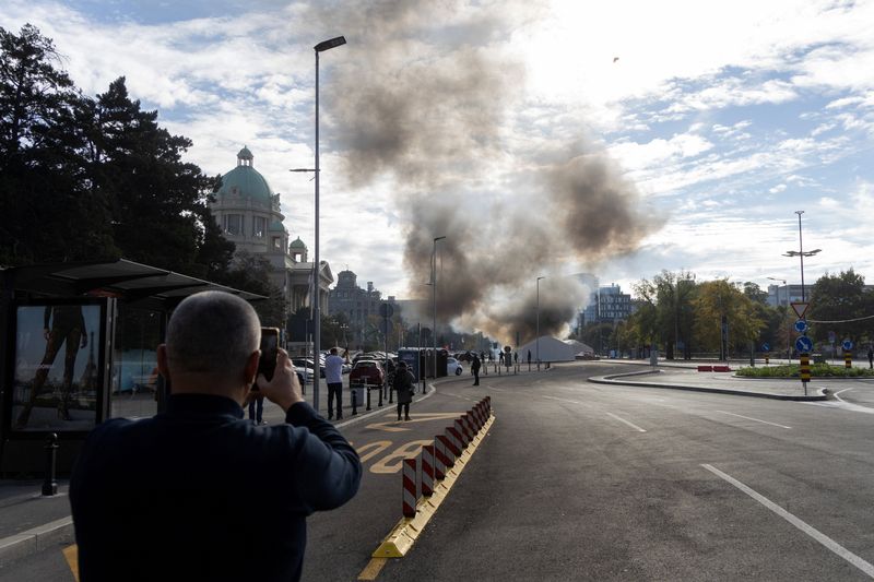 A man films with his mobile phone as smoke rises from a burning tent following an incident in front of the Parliament in Belgrade, Serbia, October 22, 2025. REUTERS/Djordje Kojadinovic