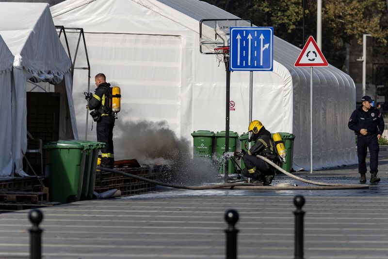 Firefighters work as smoke rises from a burning tent following an incident in front of the Parliament in Belgrade, Serbia, October 22, 2025. REUTERS/Djordje Kojadinovic