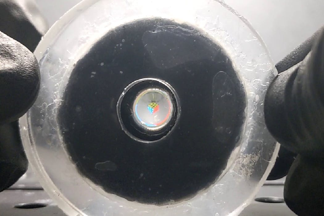 The hydrogel material contracts in response to light, allowing us to control the lens without touching it by projecting light onto its surface. This property also allows us to finely control the shape of the lens by selectively illuminating different parts of the hydrogel. By eliminating rigid optics and structures, our system is flexible and compliant, making it more durable and safer in contact with the body.
