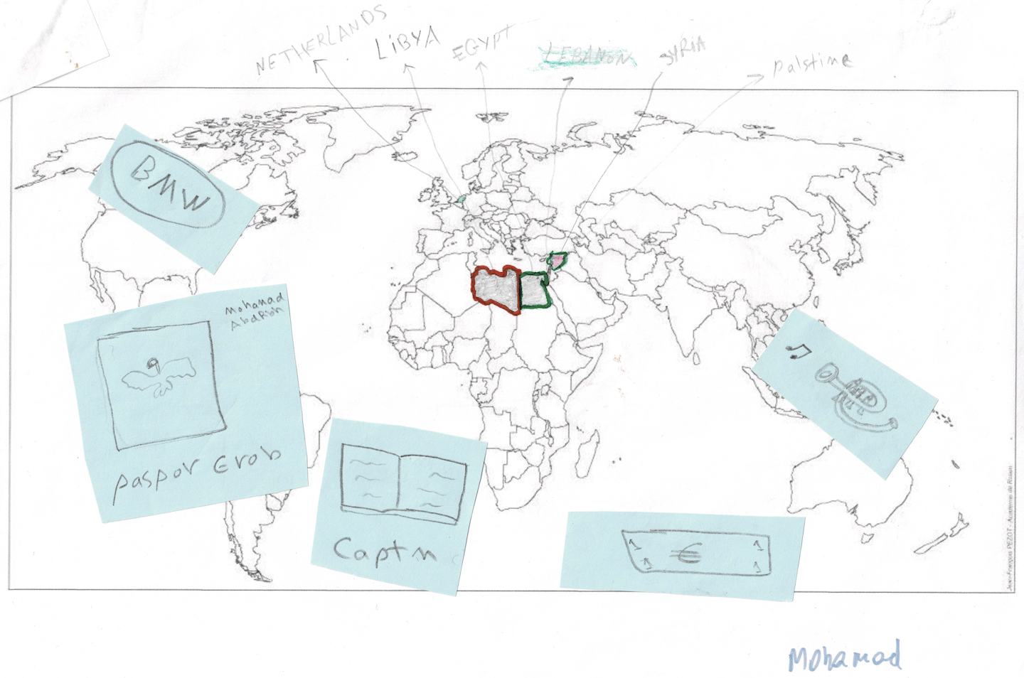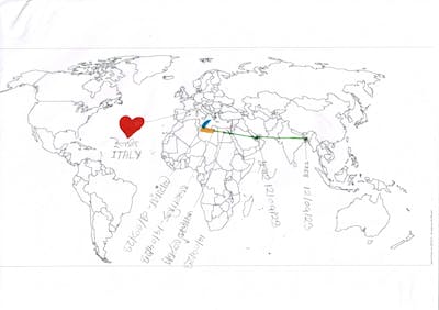 In all, 21 sketches were created in the workshops I conducted onboard the Ocean Viking. They tell fragments of journeys – routes that were sometimes smooth but often fraught, starting from Bangladesh, Pakistan, Syria, Palestine and Egypt.