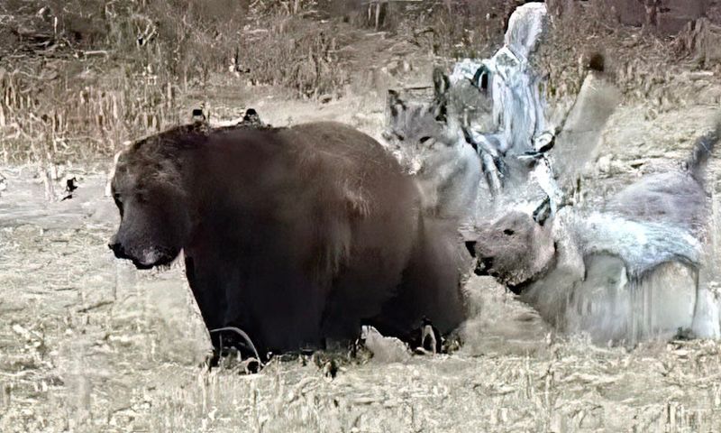 At one point the bear stops and sits upright, defensively with paws outstretched, while circled by wolves.