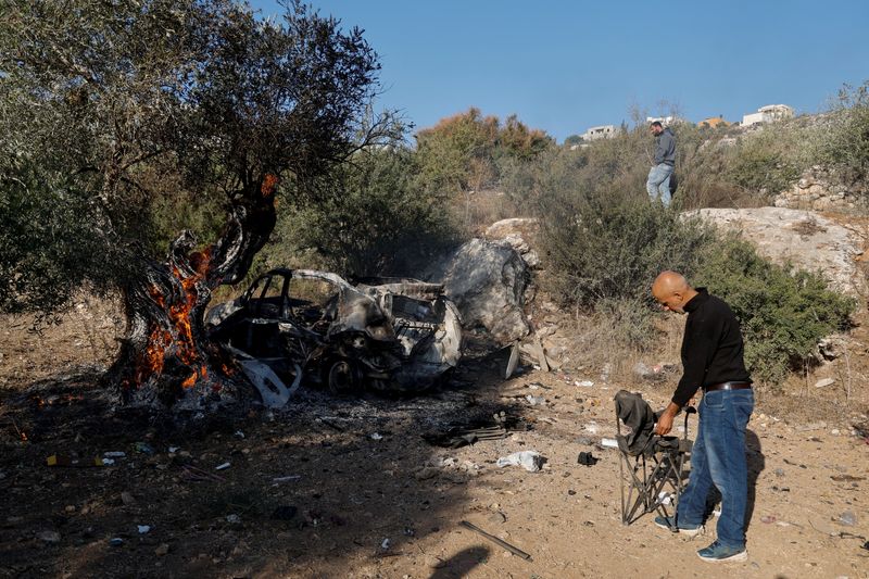 People inspect a burnt vehicle at the site where Israeli forces killed three Palestinians, near Jenin, in the Israeli occupied West Bank October 28, 2025. REUTERS/Raneen Sawafta