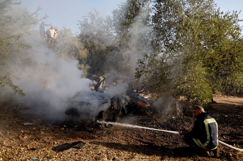 Smoke rises as a firefighter works to extinguish fire in a destroyed vehicle at the site where Israeli forces killed three Palestinians, near Jenin, in the Israeli occupied West Bank October 28, 2025. REUTERS/Raneen Sawafta