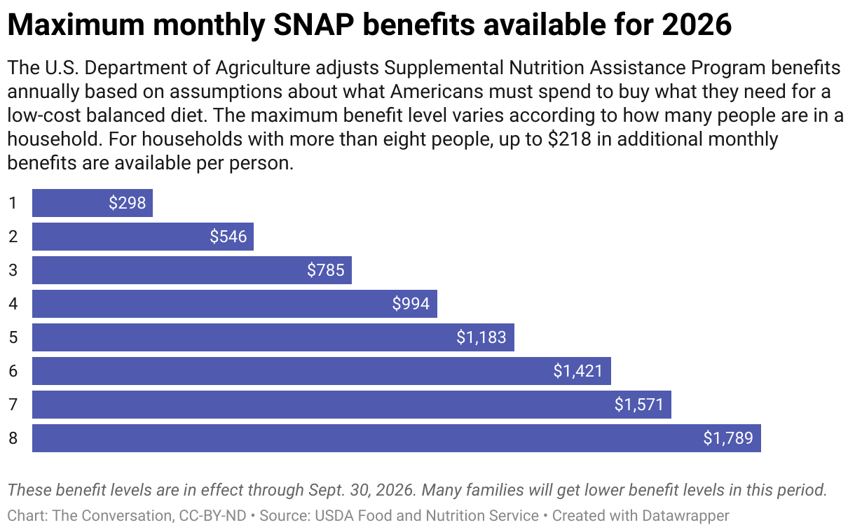 SNAP benefits – sometimes called food stamps – are provided through a federally funded program administered by the states. The amount of help received depends on a family’s income and the number and ages of the people in the household. Currently, benefits average just over US$6 per person per day. In Pennsylvania, the monthly benefits are loaded onto participants’ electronic benefits transfer cards, or EBT cards, during the first 10 business days of each month.