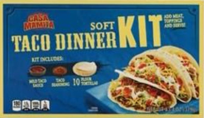 - Casa Mamita Soft Taco Dinner Kit – UPC: 4099100318715, Lot code: 25259, Best if used by date: March 15, 2026