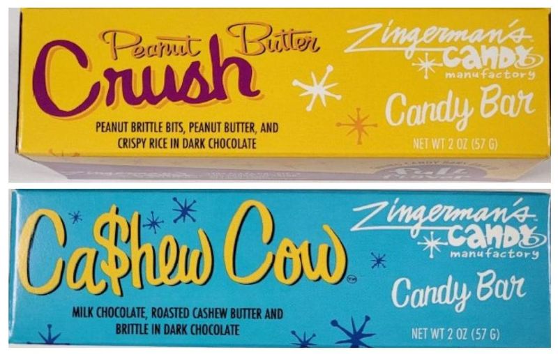 - Cashew Cow Bars packaged in Zingerman’s Candy Manufactory light blue and yellow 2 oz. boxes labeled Cashew Cow with Lot #174250.