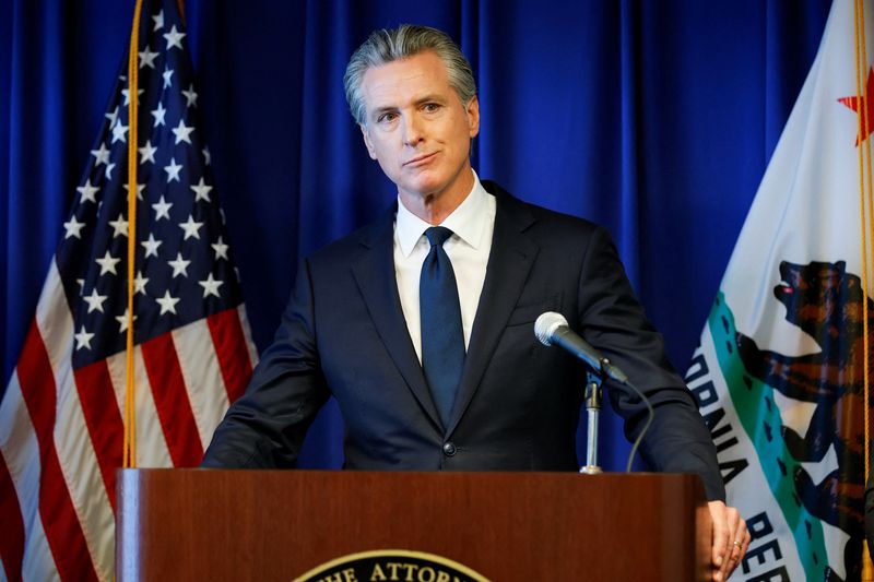 California Governor Gavin Newsom reacts to a reporters question after his announcement that California is suing the White House to restore SNAP funding before the cutoff during a news conference in Sacramento, California, U.S. October 28, 2025. REUTERS/Fred Greaves