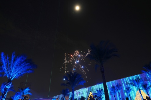 Mientras una orquesta tocaba fanfarrias, filas de actores vestidos con atuendos del antiguo Egipto se alineaban alrededor del museo, las pirámides y la Esfinge. Cientos de drones crearon un espectáculo de luces en el cielo, representando a dioses egipcios como Isis y Osiris y las pirámides.