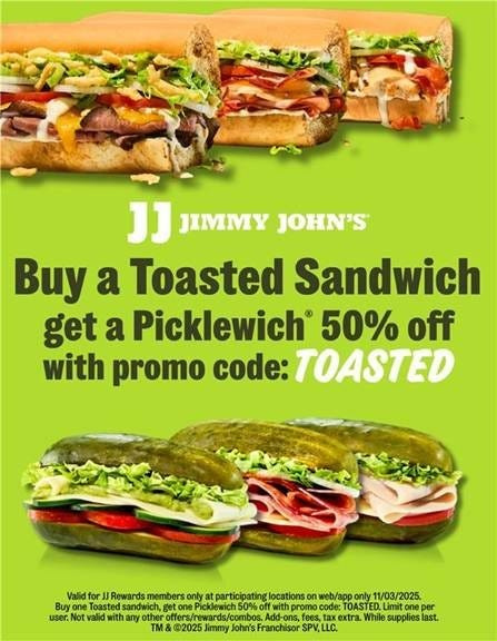 On Nov. 3, JJ Rewards members can buy their favorited toasted sandwich and get a Picklewich for 50% off using code "TOASTED." The Picklewich is an original sandwich stacked between thick-cut pickle slices instead of bread for a "fresh, zesty bite," according to the Jimmy John's website.