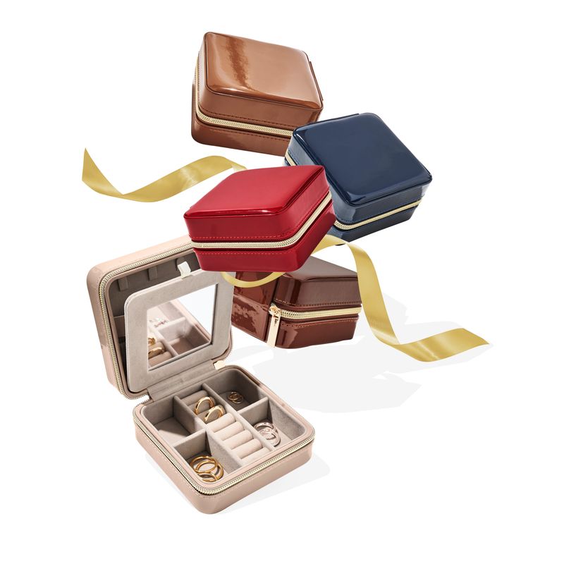 Keep all of your jewelry safe and sound when traveling with this sleek and compact Brouk and Co. case. The vegan patent leather travel jewelry case has compartments for rings, earrings, necklaces – plus a little travel mirror – to provide organization on the go. $20.