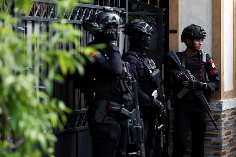 Armed police personnel stand guard outside an area after an explosion occurred at a school complex in Jakarta, Indonesia, November 7, 2025. REUTERS/Willy Kurniawan