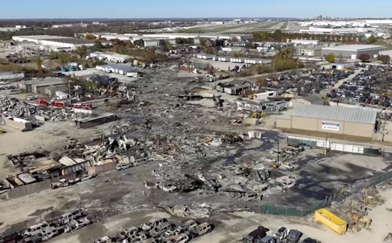 The footage from drone cameras shows a large area of industrial Louisville charred and blackened from smoke and fire damage. Burned-out cars, debris from buildings and mangled wreckage can be seen.