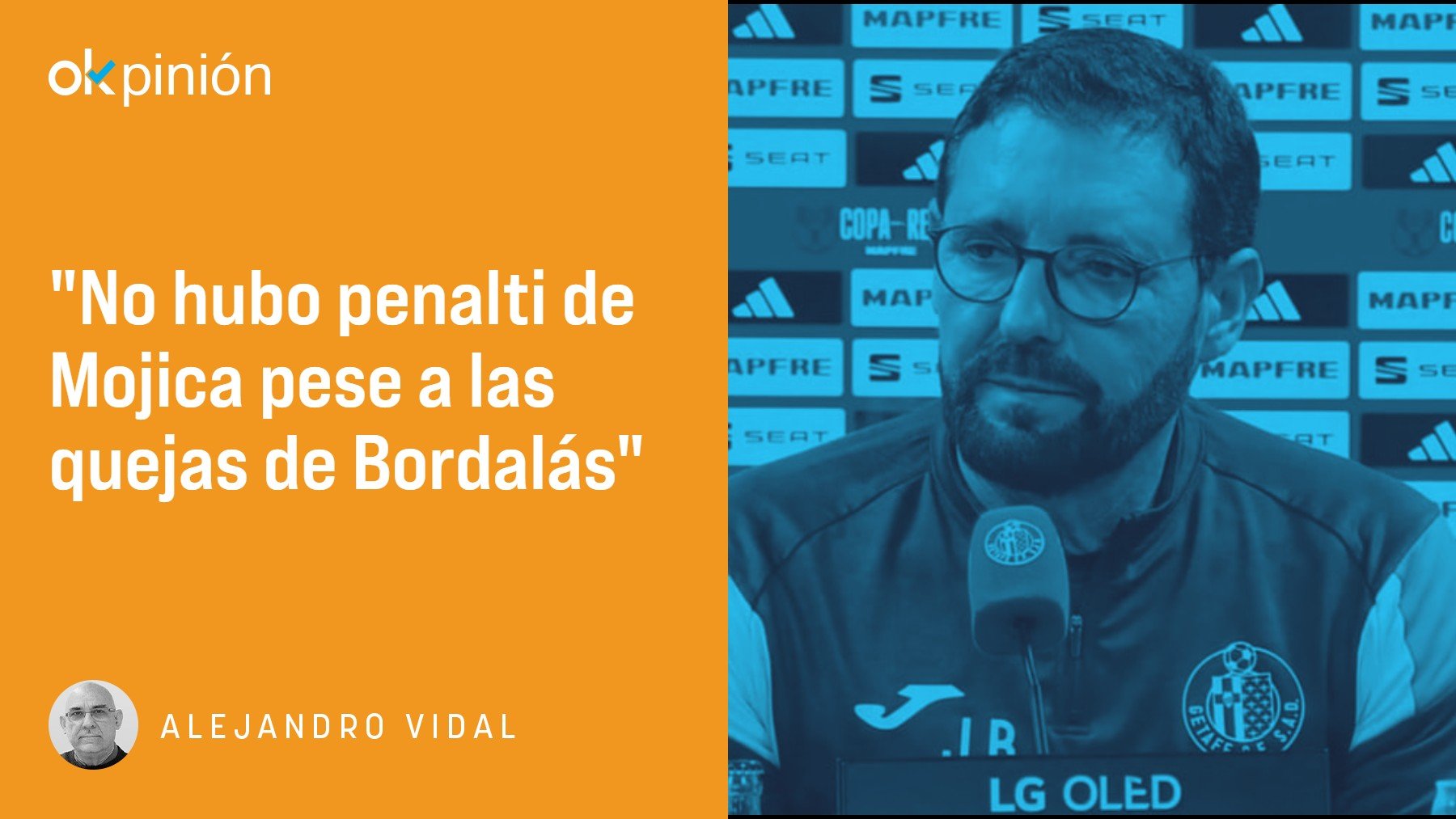 El entrenador del Getafe se queja de un penalti que según él vió toda España, en una mano de Mojica en pugna con Arambarri, que tiene de ingenuo lo que yo de bombero. Ambos confunden lo incidental con lo accidental. Tampoco pediremos peras al olmo. Dicho golpe con el brazo se produce en el seno de una disputa en la que convergen el brazo del delantero con el del defensa. No hay peligro de gol, habría que discutir si la acción ofensiva provoca el rebote defensivo y, sea como sea, el balón queda muy fuera del ángulo de la portería y se dirige a la línea de fondo sin opción alternativa.
