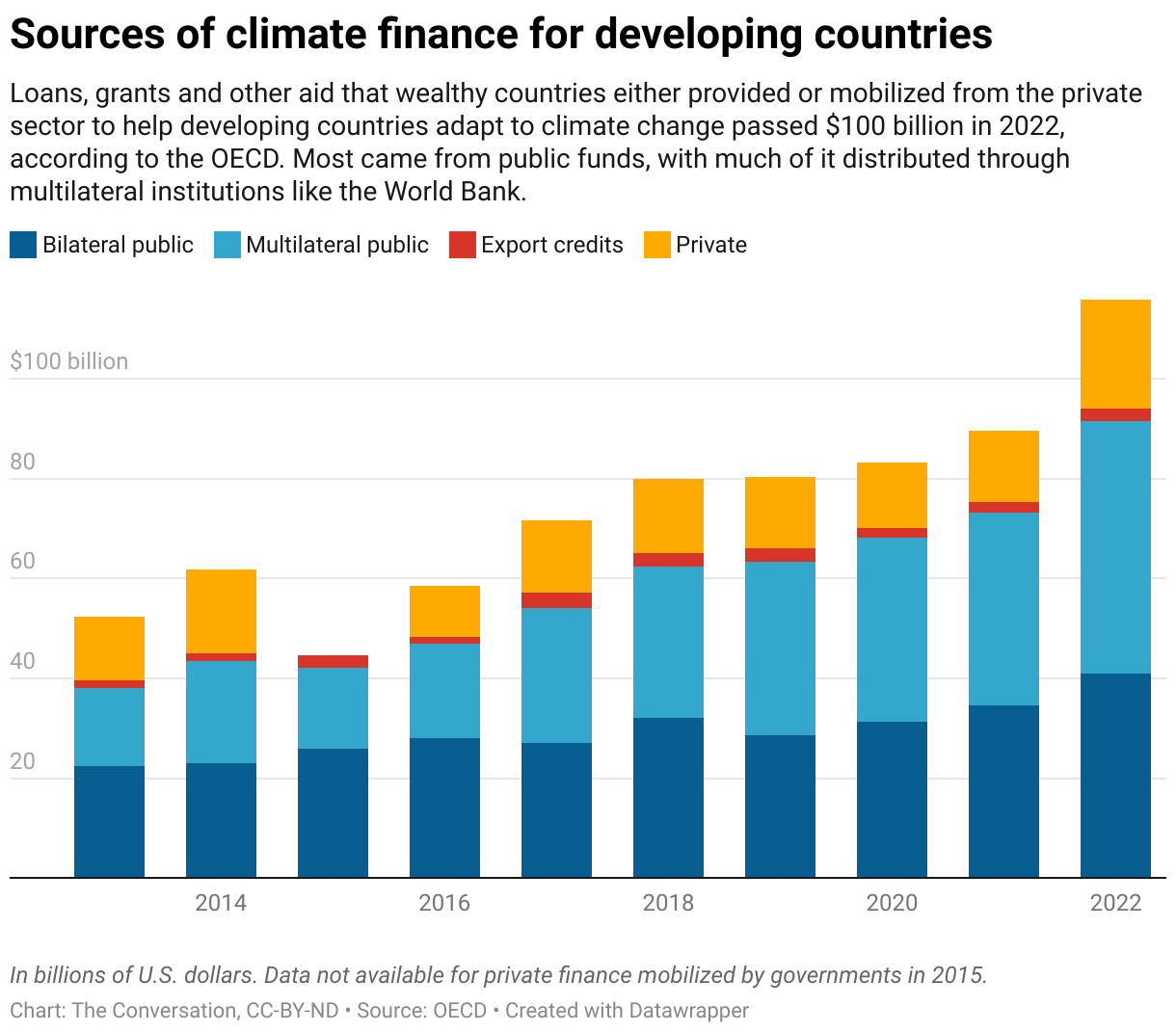 What’s counted as climate finance comes from a mix of sources and is predominantly provided through loans and grants. Some funding is bilateral, flowing directly from one country to another. Some is multilateral and distributed through organizations such as the World Bank or the Green Climate Fund that are funded by the world’s governments. Money from private investors and corporations can also count in this growing but fragmented system.