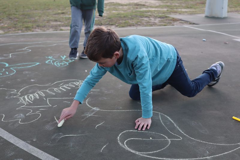 Peals of laughter sound from the monkey bars, where several girls swing, with tie dye pink Labooboo dolls in tow. Another group of kids covers the asphalt basketball court with chalk drawings of the Greek gods Poseidon and Hades while some boys starts a pickup game of football.