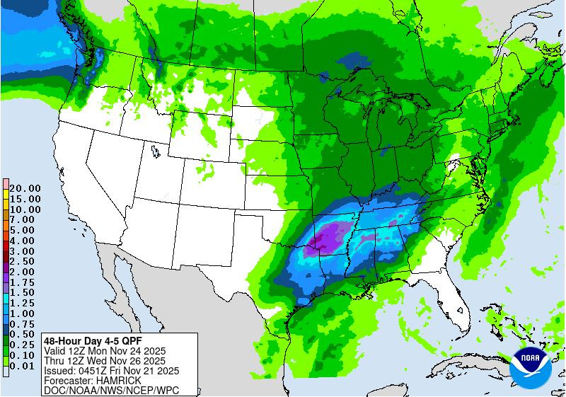 The first couple of days in the holiday week will feature a rainstorm in the south-central U.S. According to the National Weather Service, widespread moderate to heavy rainfall, mainly in the form of repeating rounds of thunderstorms, is likely from northeastern Texas to the greater Memphis metro area on Monday, Nov. 24.