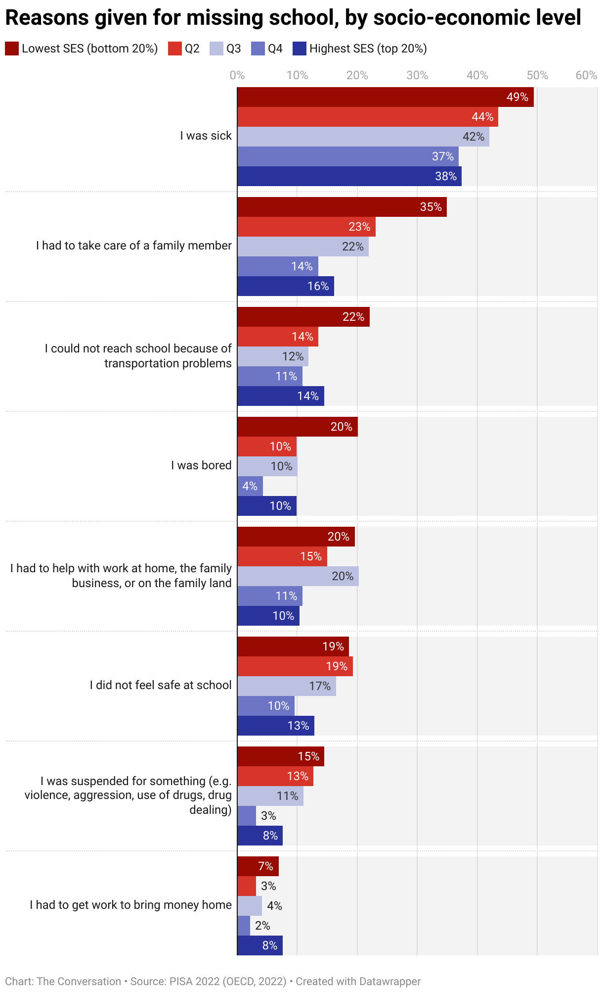 Socially disadvantaged students are almost three times more likely than their advantaged peers to miss school for long periods. The reasons can include illness, family caring responsibilities and lack of safety at school.