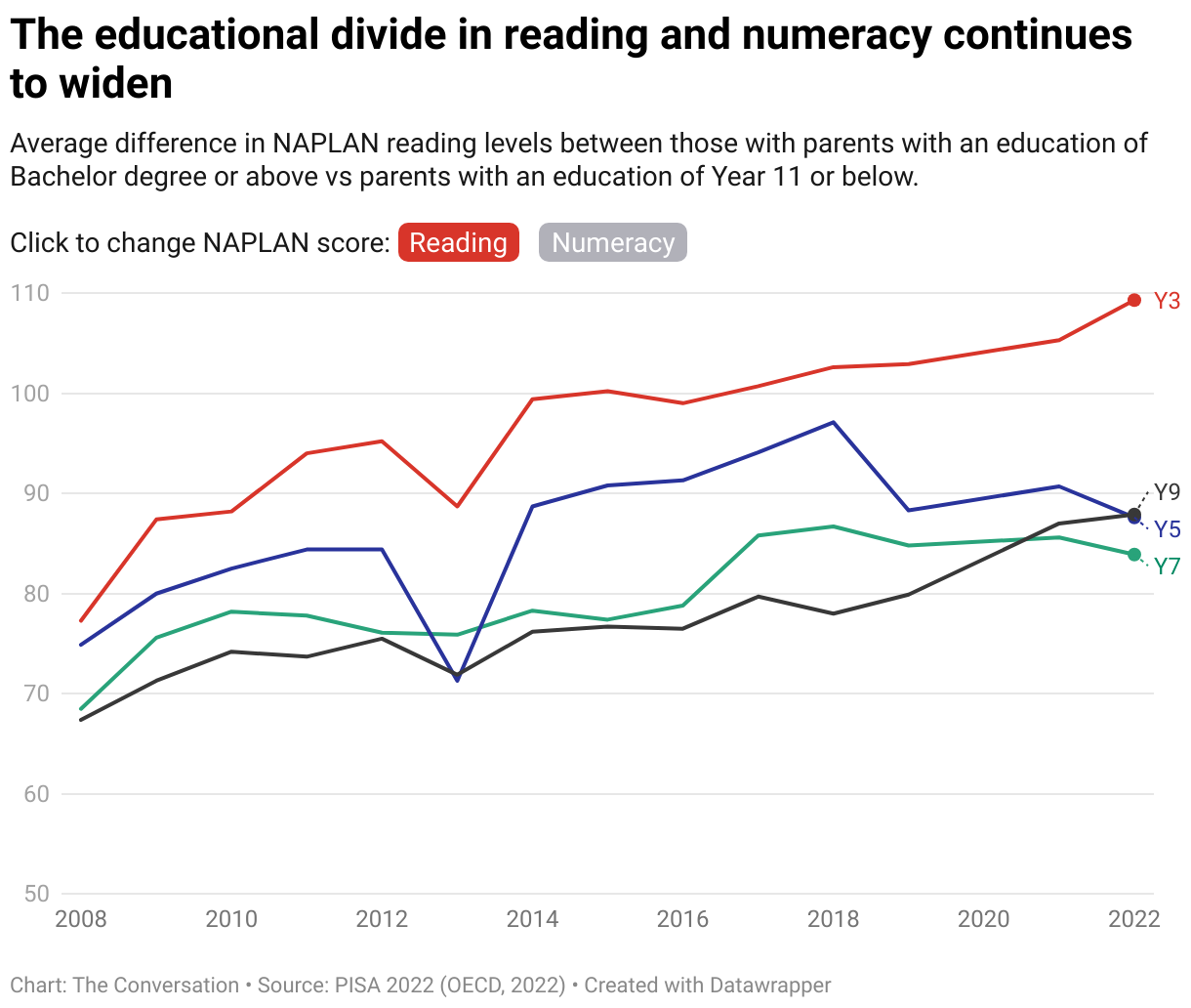 As the chart below shows, there is a significant learning gap between high- and low-socioeconomic status students. This equates to more than five years by Year 9, according to NAPLAN results.