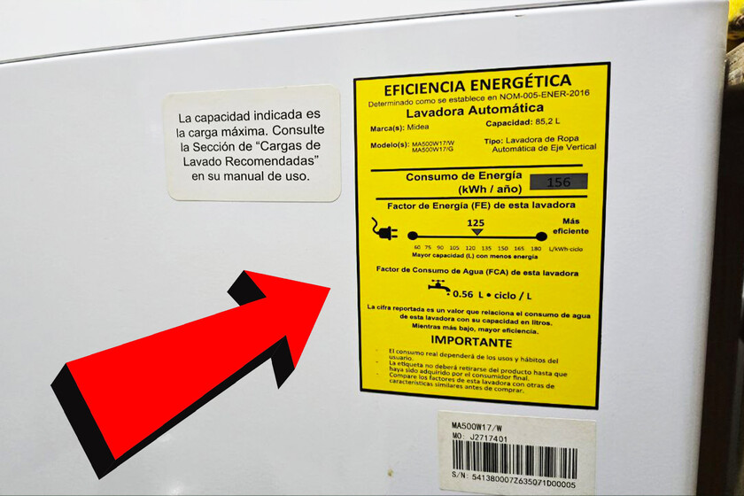 Esta etiqueta suele tener como título "Eficiencia Energética". En ella deben venir datos como el tipo de lavadora, la capacidad en litros, el tipo de eje y, lo principal, el consumo de energía al año . Y aquí es donde debemos comenzar a interpretar con base en los datos.