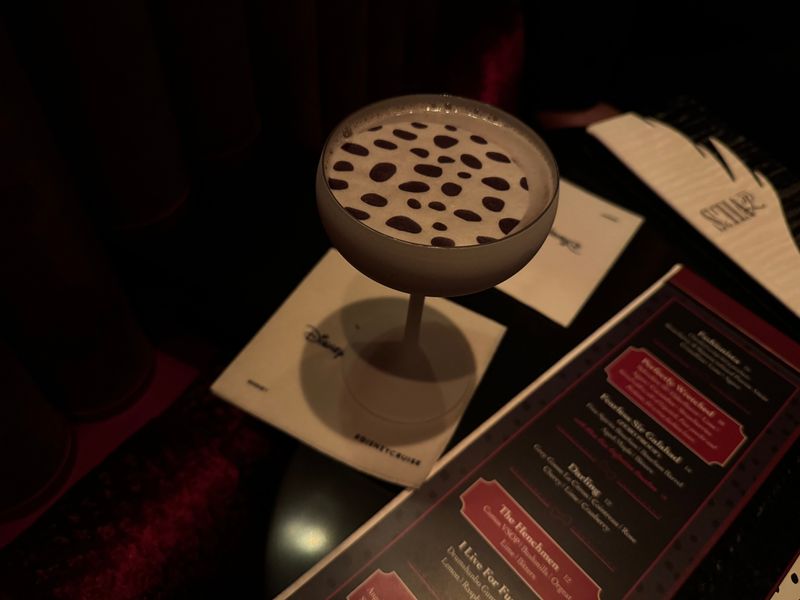 I enjoyed the musical stylings of a pianist at De Vil’s, a new Cruella de Vil-themed lounge, one evening while sipping this aptly named cocktail. The drink was smooth and lightly sweet, made with Drumshanbo Gunpowder gin, lemon, raspberry and vanilla.