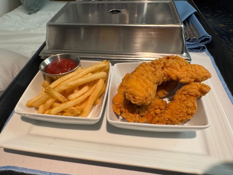 A crew member delivered the food to my cabin – most room service items are included with the fare, so I took full advantage. The chicken was crunchy on the outside but moist and tender on the inside. The side of crispy, thin-cut fries held their own, too.