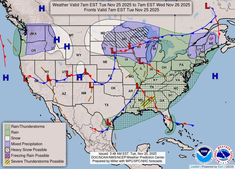 According to a forecast Tuesday, Nov. 25, from the Storm Prediction Center, isolated severe storms were possible across parts of the Southeast and Deep South through the early evening. "A couple tornadoes are possible in parts of eastern Mississippi and central Alabama," the center said in an online forecast.