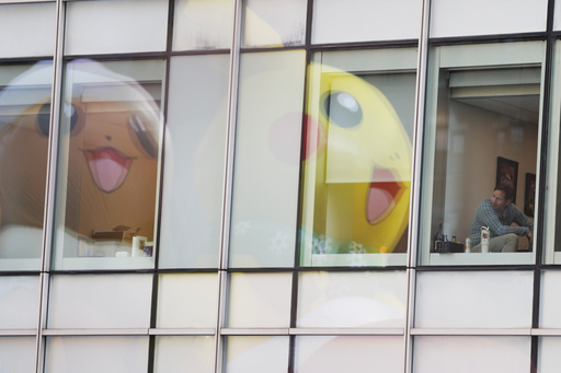 Gente dentro de edificios de oficinas observa cómo pasa el globo de Pikachu durante el Desfile del Día de Acción de Gracias de Macy's, el jueves 27 de noviembre de 2025, en Nueva York. (Foto AP/Heather Khalifa)