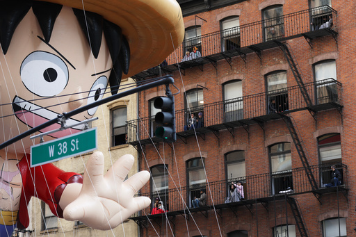 Gente observa desde sus balcones cómo el globo de Monkey D. Luffy pasa junto a ellos durante el Desfile del Día de Acción de Gracias de Macy's, el jueves 27 de noviembre de 2025, en Nueva York. (Foto AP/Heather Khalifa)