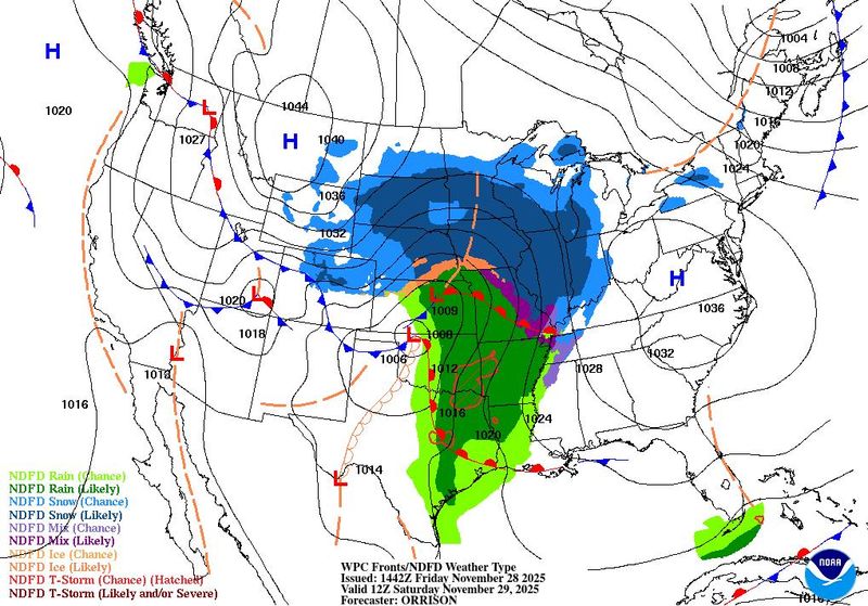 While the north-central U.S. deals with snow, heavy rain and potentially severe thunderstorms are forecast to rattle the south-central states on Saturday Nov. 29.